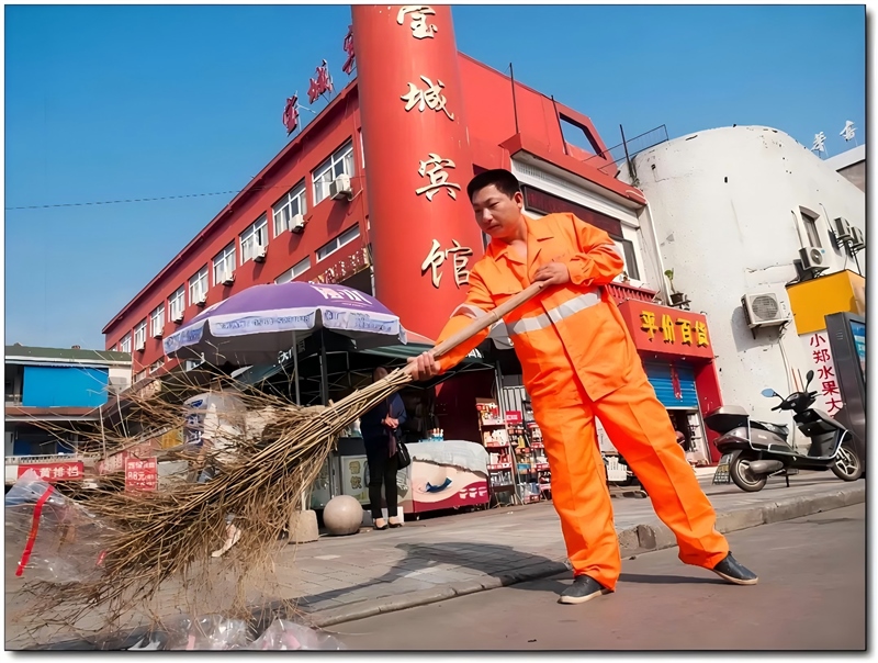 他每天早上四點(diǎn)多就準(zhǔn)時(shí)出現(xiàn)在街頭,先是拿著大笤帚把街道從頭到尾普掃一遍,忙到上午八點(diǎn)多鐘,接著就拎著小掃帚和簸箕定點(diǎn)清掃。到了下午兩點(diǎn)鐘,他會(huì)再把整條街普掃一遍,一直要忙到五點(diǎn)多才能下班。大熱天里,他身上的衣服經(jīng)常是濕了干、干了又濕,白色的鹽漬積了一層又一層,他卻全然不顧。